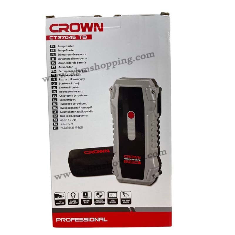 Boosteur de batterie professionnel CROWN CT37045 avec batterie haute capacité de 16000 mAh conçu pour démarrer rapidement et en toute sécurité les véhicules. Compact, robuste et facile à utiliser, il inclut des ports USB pour recharger vos appareils et offre une solution fiable en cas de batterie à plat.