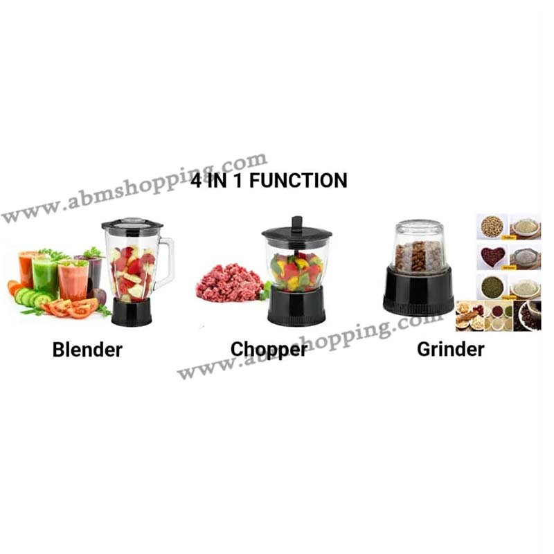 - Fonctions : Centrifugeuse + blender + hachoir à viande + moulin à café ⇒ 4 en 1.