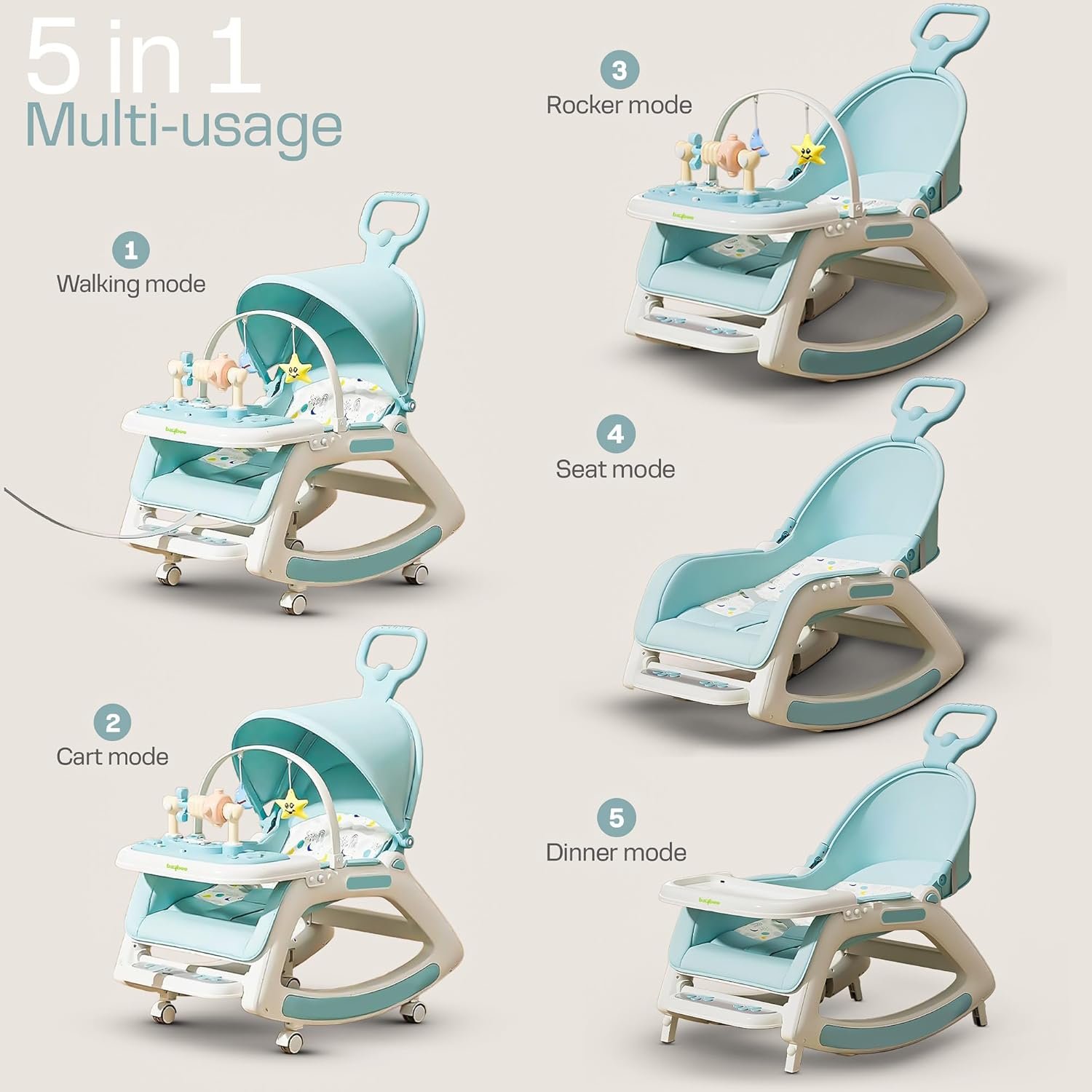 • Produit 5-en-1 : balancelle, trotteur, chaise repas, chariot, siège